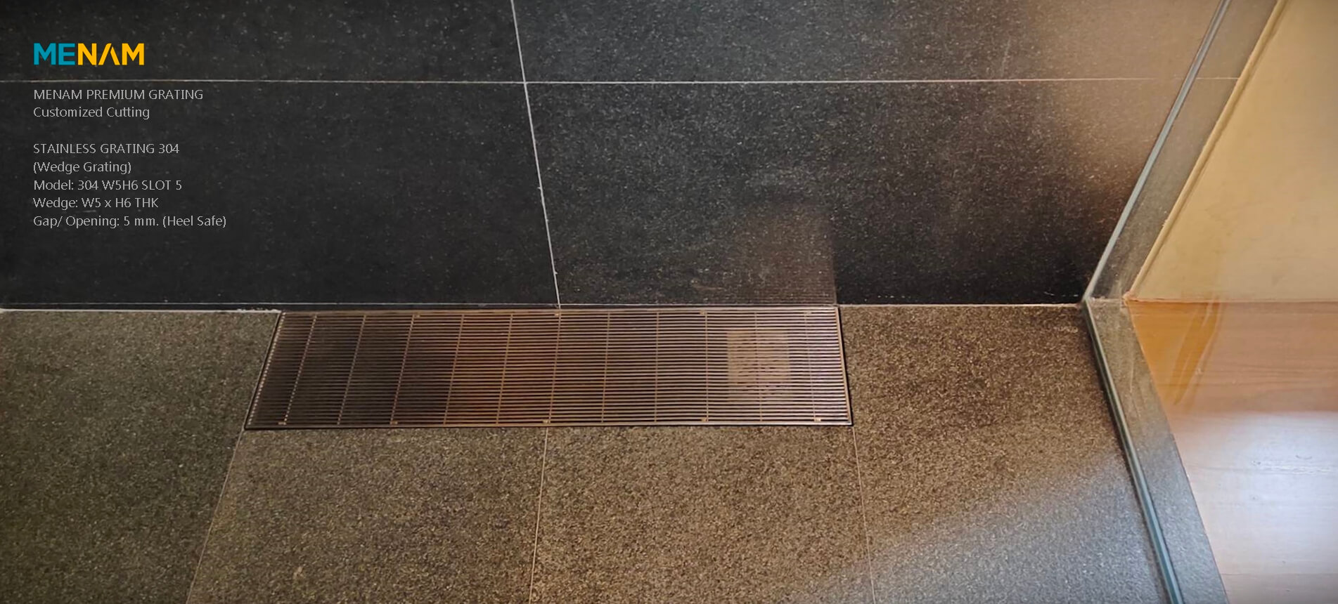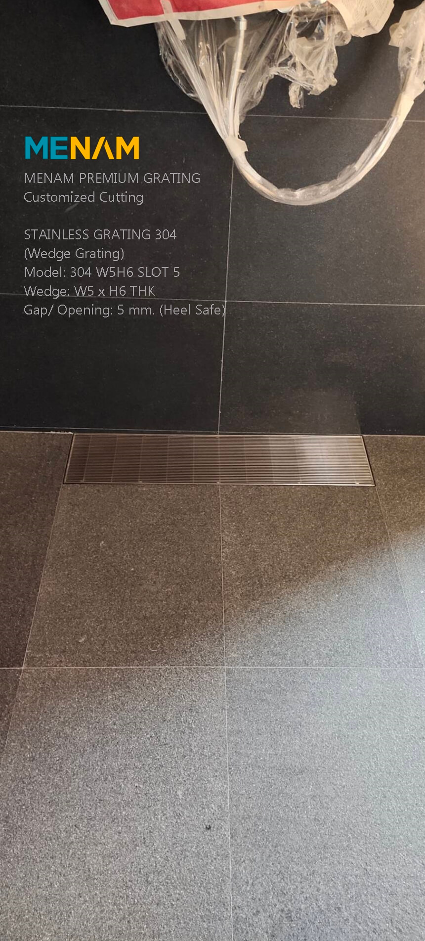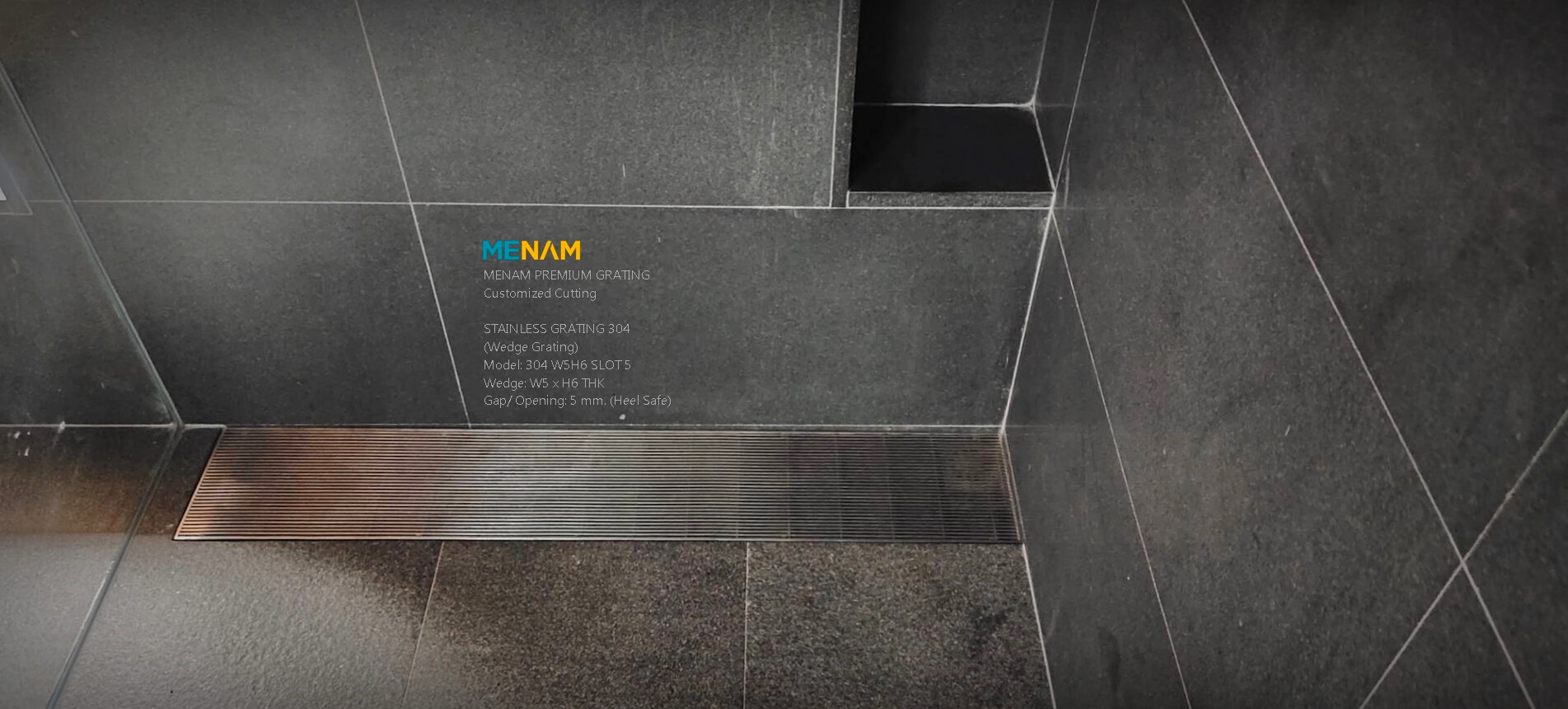 MENAM PREMIUM GRATINGCustomized CuttingSTAIN LESS GRATING 304(Wedge Grating)Model: 304 W5H6 SLOT 5Wedge: W5 x H6 THKGap/ Opening: 5 mm. (Heel Sate)